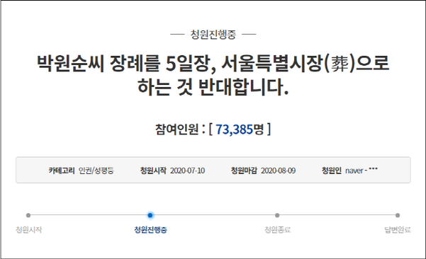 청원인은 "박원순씨가 사망하는 바람에 성추행 의혹은 수사도 하지 못한 채 종결되었지만, 그렇다고 그게 떳떳한 죽음이었다고 확신할 수 있나"라며 "성추행 의혹으로 자살에 이른 유력 정치인의 ‘화려한 5일장’을 언론에서 국민이 지켜봐야하나"라고 썼다.